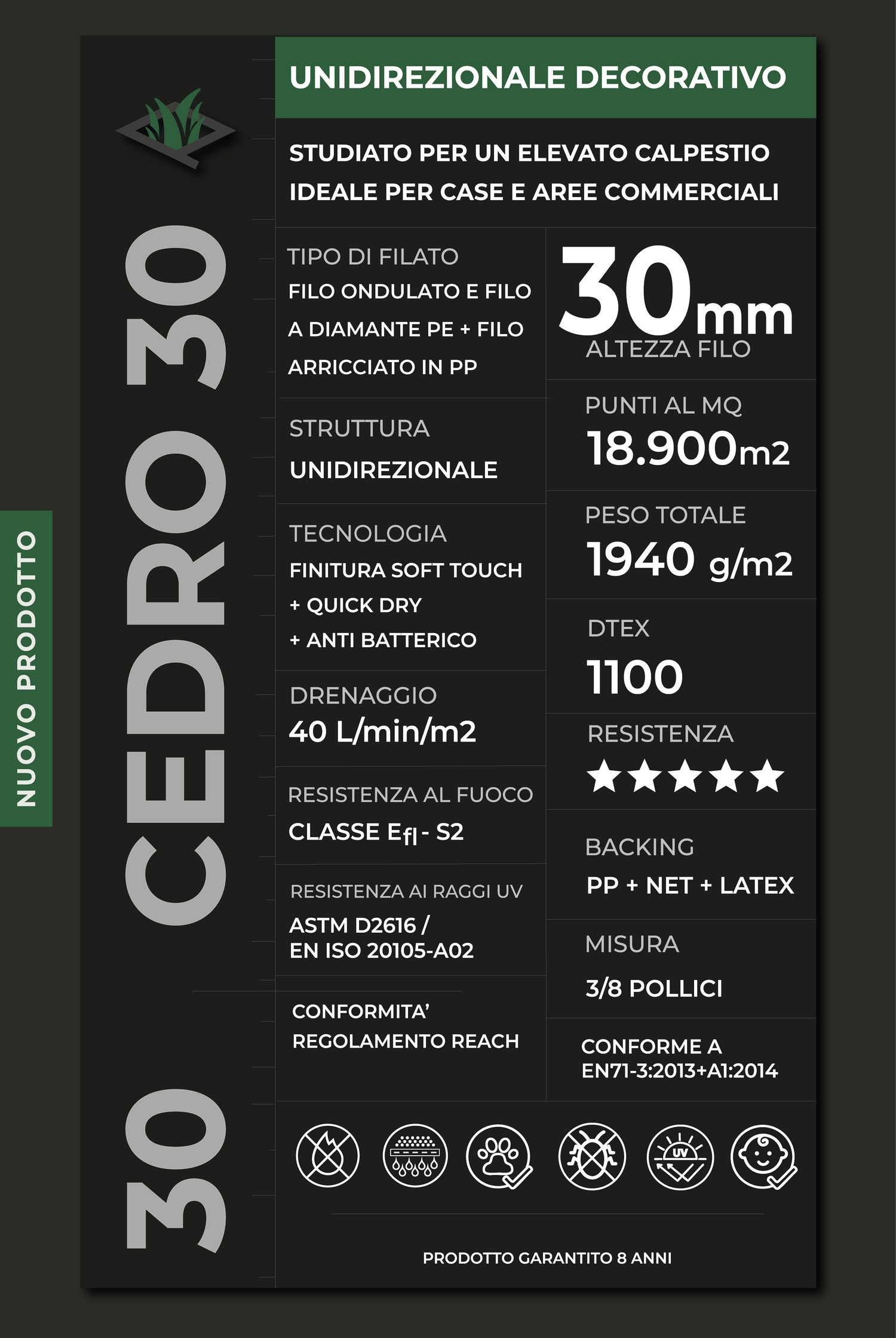 Il Cedro 30 mm è un prato sintetico decorativo pensato per chi cerca un equilibrio ideale tra naturalezza visiva e praticità.