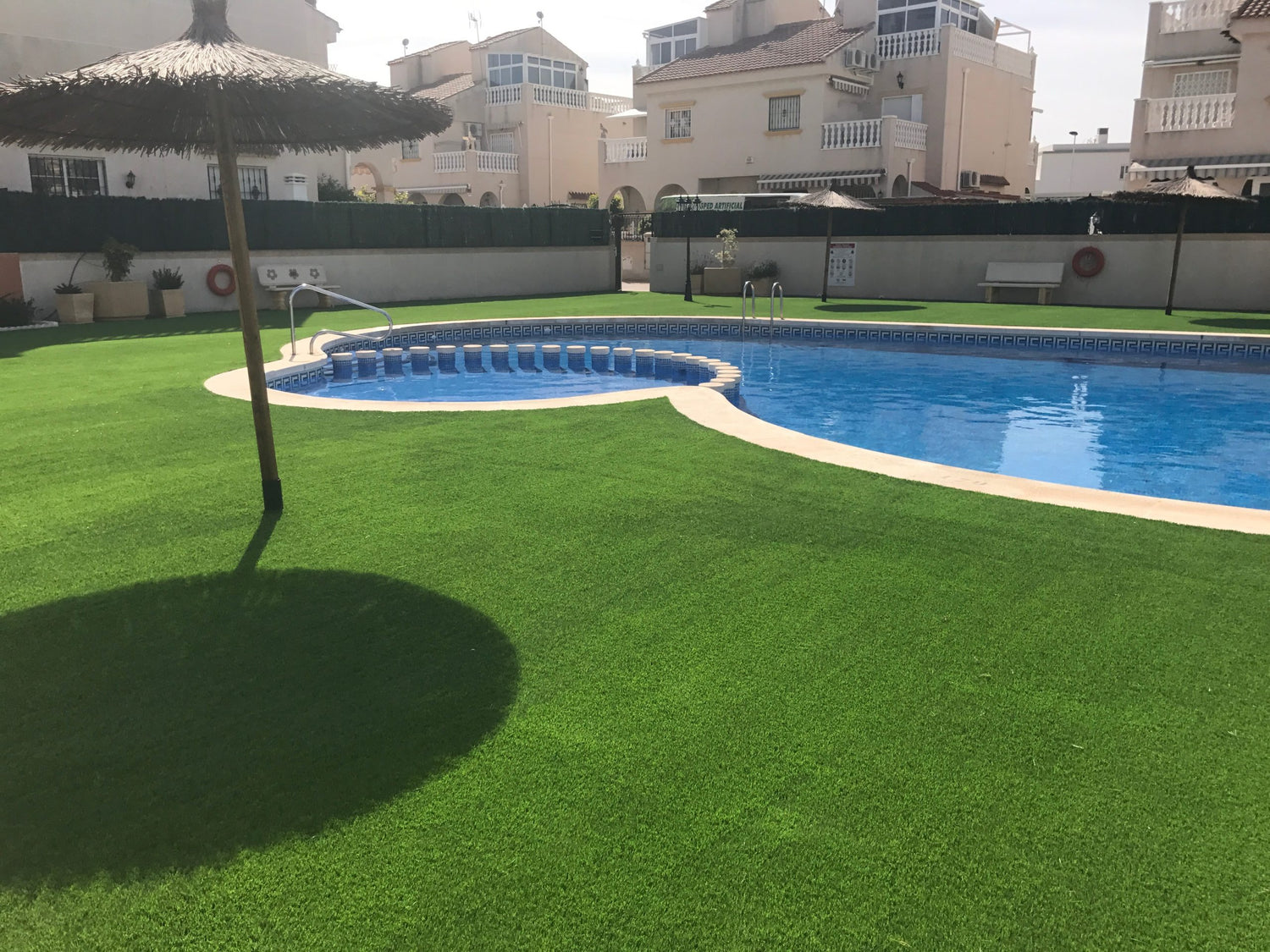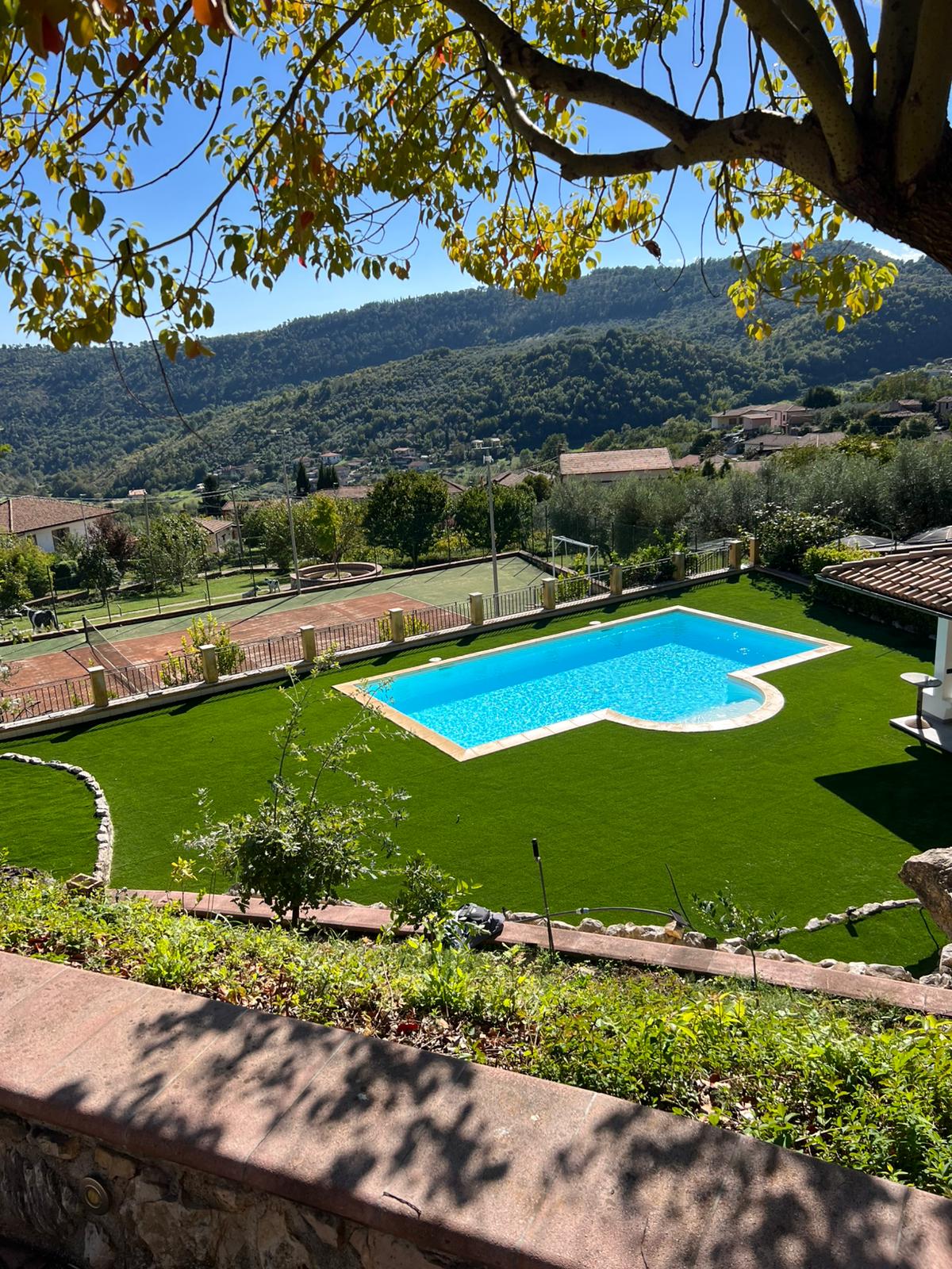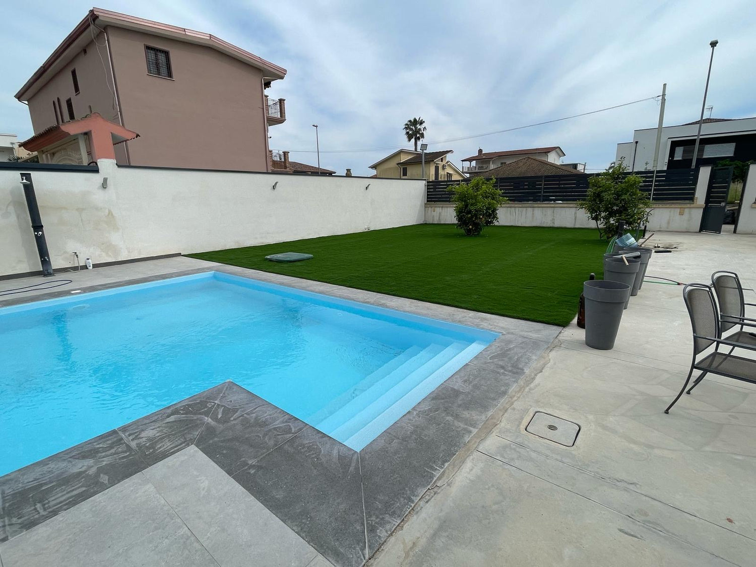 Abbiamo posato un prato sintetico drenante, antiscivolo e resistente al cloro, pensato specificamente per le aree bagnate, con risultato sempre verde e zero manutenzione stagionale.