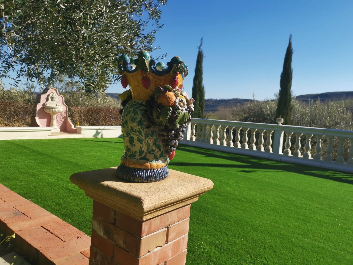 Antonella voleva dare nuova vita al terrazzo della sua villa di campagna, incorniciato da una balaustra in pietra e affacciato su un paesaggio di ulivi e cipressi. Il prato naturale non reggeva all'estate siciliana — siccità, caldo intenso e scarsa irrigazione lo rendevano ingiallito per mesi.
