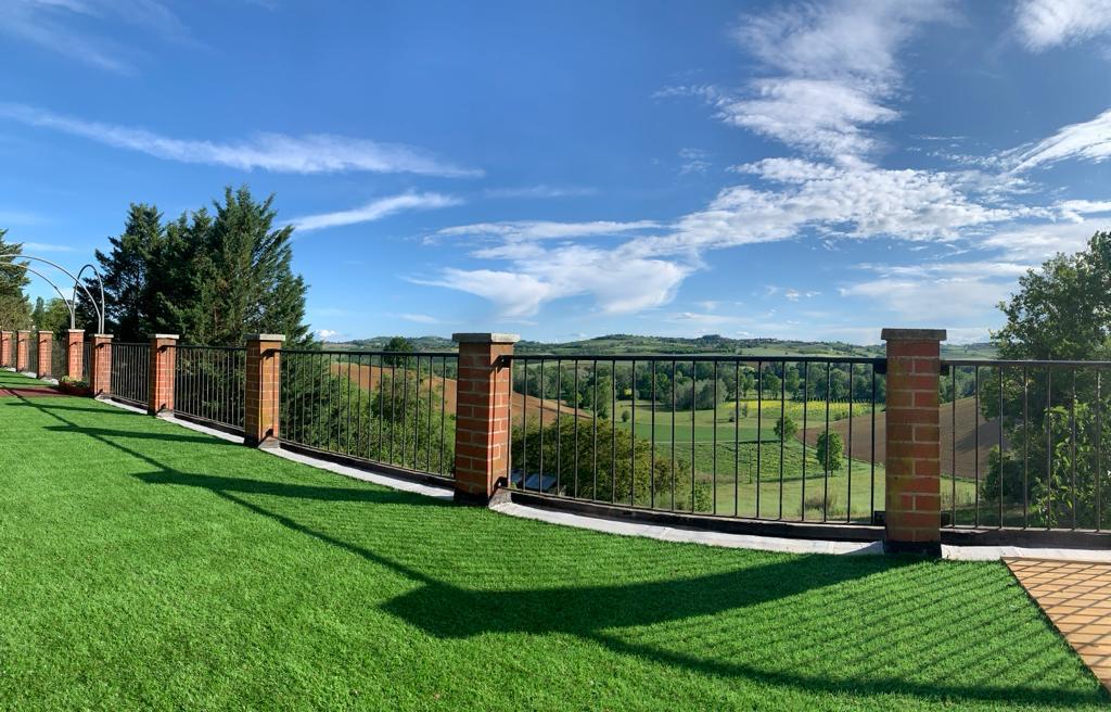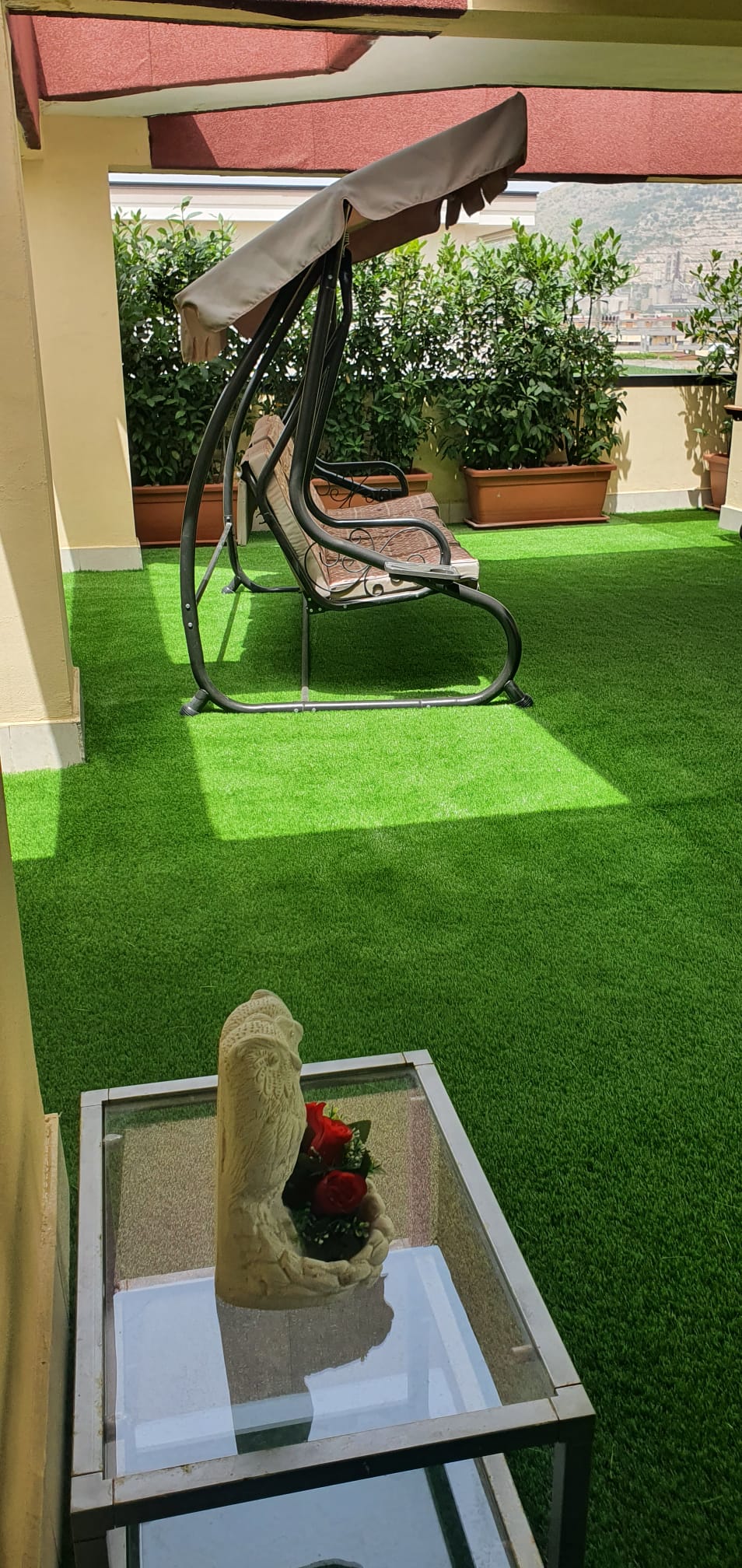 Il prato sintetico ha restituito al terrazzo il suo verde costante tutto l'anno, valorizzando l'architettura tradizionale e creando uno spazio sempre accogliente, anche senza manutenzione.