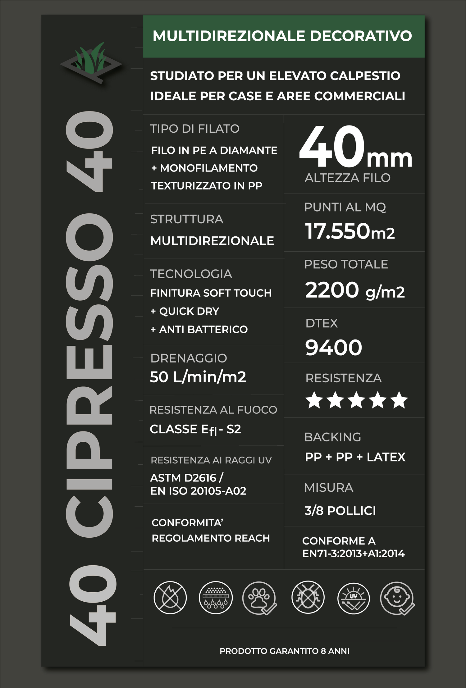 Il Cipresso 40 mm è il prato sintetico più scelto della collezione, grazie a una resa estetica estremamente naturale e uniforme.